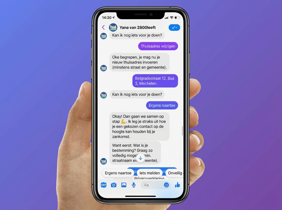 In the city of Mechelen, youngsters can activate an extra digital layer of security when they go out. Together with the city, we developed YANA — a chatbot on Facebook Messenger that accompanies you through the city, automatically confirms your safe arrival to contacts, and alerts someone when you don't respond in time.